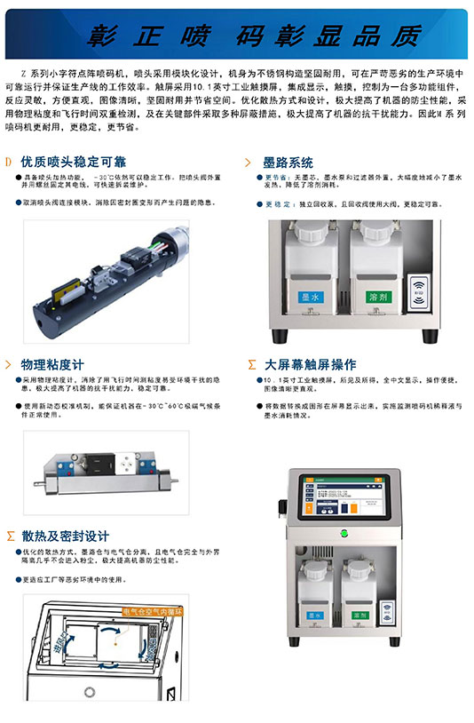 Z系列小字符點陣噴碼機,噴頭采用模塊化設(shè)計,機身為不銹鋼構(gòu)造堅固耐用,可在嚴苛惡劣的生產(chǎn)環(huán)境中可靠運行并保證生產(chǎn)線的工作效率。觸屏采用10.1英寸工業(yè)觸摸屏,集成顯示,觸摸,控制為一臺多功能組件,反應(yīng)靈敏,方便直觀,圖像清晰,堅固耐用并節(jié)省空間。優(yōu)化散熱方式和設(shè)計,極大提高了機器的防塵性能,采用物理粘度和飛行時間雙重檢測,及在關(guān)鍵部件采取多種屏蔽措施,極大提高了機器的抗干擾能力。因此Z系列噴碼機更耐用,更穩(wěn)定,更節(jié)省。